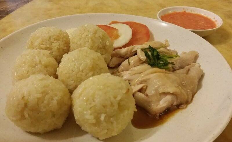Bite-sized glutinous rice balls flavored with pandan leaves and chicken broth, served with tender poached chicken, fragrant dipping sauce, and a garnish of fried shallots...