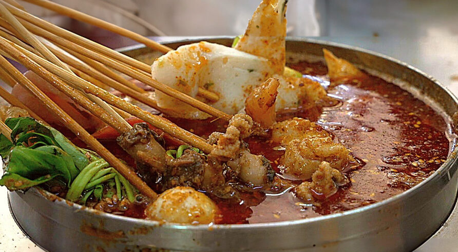 Skewered meats, vegetables, and tofu dipped in a communal pot of simmering peanut sauce, offering a fun and interactive dining experience.