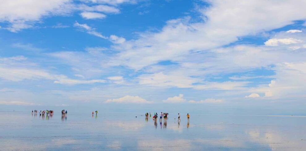 A unique natural phenomenon where a shadow sandbar emerges during low tide, creating a mirror-like reflection of the sky.