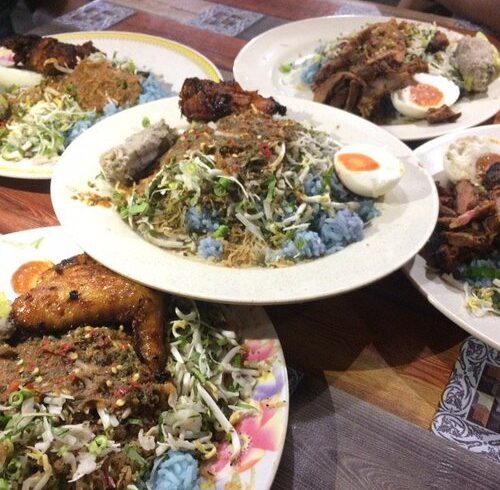 Nasi kerabu consists of bright blue tinted rice, usually eaten with ulam, fried salted fish, fish crackers, and other garnishing. The rice is blue due...