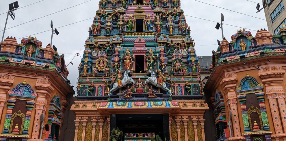 1800s Hindu temple, Kuala Lumpur's oldest, featuring a monumental, ornately carved entrance tower.